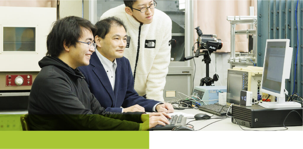 工学部における最大のハイライトは、4年生で取り組む卒業研究ですが、本分野では卒業研究を通じて、各教員の専門分野での企業や他の研究機関との共同研究や研究プロジェクトに参加する機会が多いことも特徴です。卒業生は、これらの活動を通して現代社会の課題や未来の技術に直結する実践的、創造的な力を身に付け、大手の機械・電気・医療機器・素材メーカーやエネルギー関連企業など、希望する多岐にわたる分野の企業に就職し、中核となる技術者として活躍しています。もちろん、地域と連携した研究もありますので地元企業への就職にも強みを持ちます。