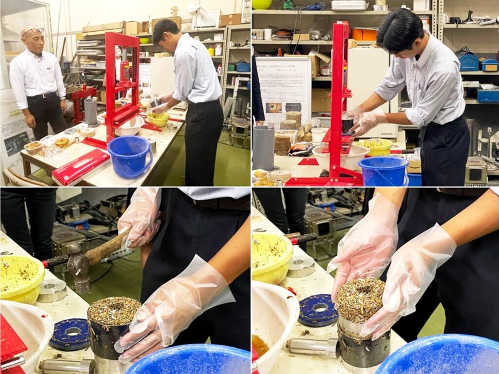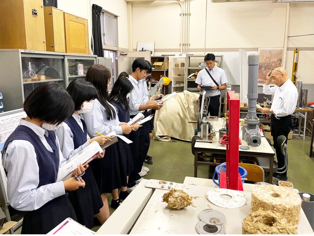 生徒たちは、実際に「バイオマスブリケット」作りを体験することで、課題研究で取り組んでいるジャイアントミスカンサスの活用方法について、具体的にイメージすることができたようです。今回の訪問が、皆さんの研究成果に貢献できることを願っています。