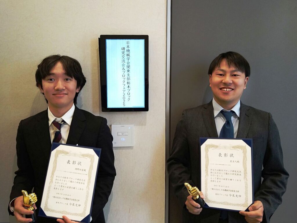 2025年10月19日(日)にライトキューブ宇都宮で開催された日本機械学会栃木ブロック研究交流会2025にて、工学部 機械分野4年の岡野快星さん、星圭人さん(指導教員 藤本正和准教授)が、優秀発表賞を受賞しました。