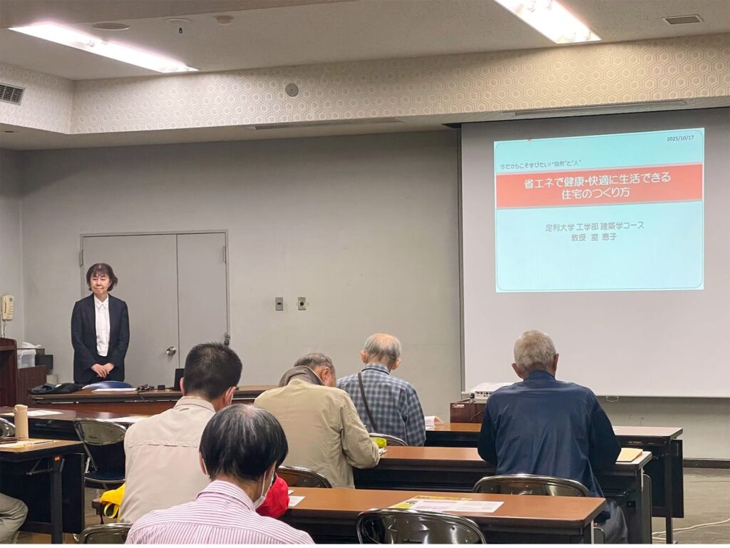 2025年10月17日(金)、建築・土木分野、建築学コースの室 恵子教授が、足利市織姫公民館が主催する地球市民講座Vol.36 「足利大学講演」(連続4回)「今だからこそ学びたい!自然と人」の3回目として、「省エネで健康・快適に生活できる住宅のつくり方」を主題とする講演を行いました。