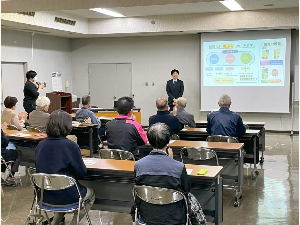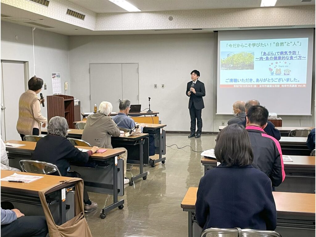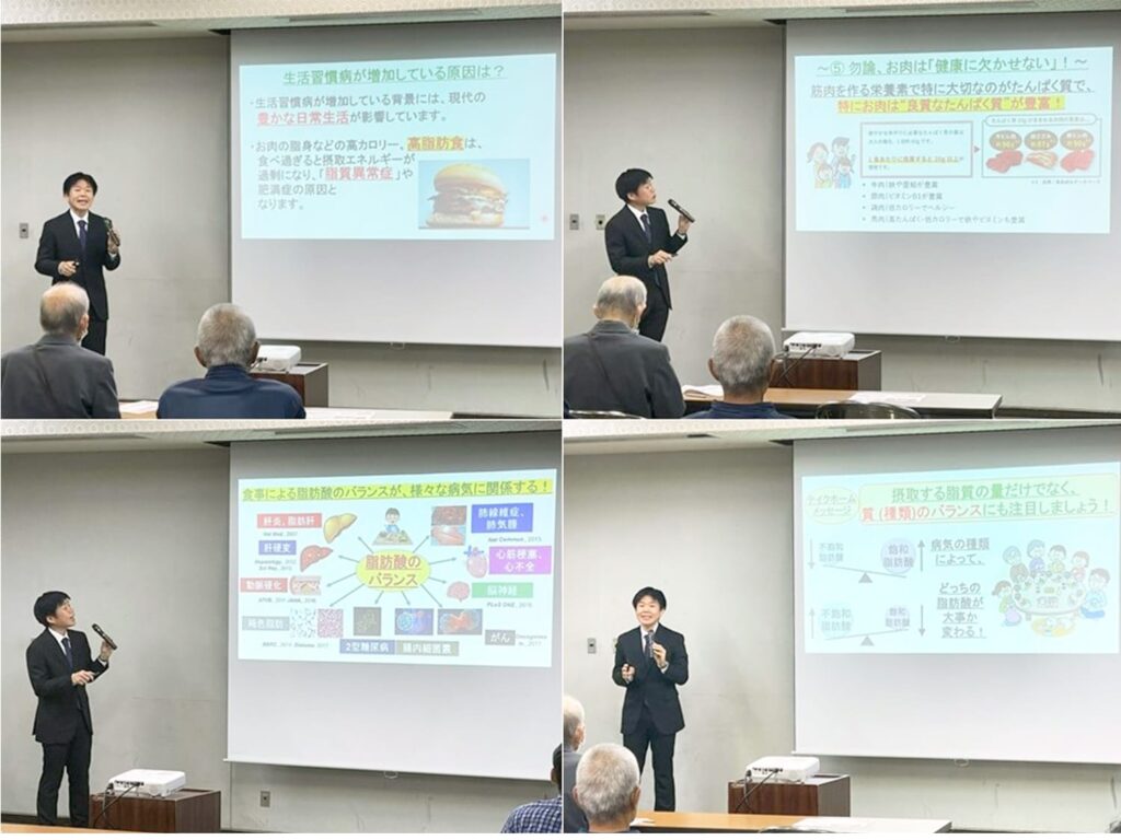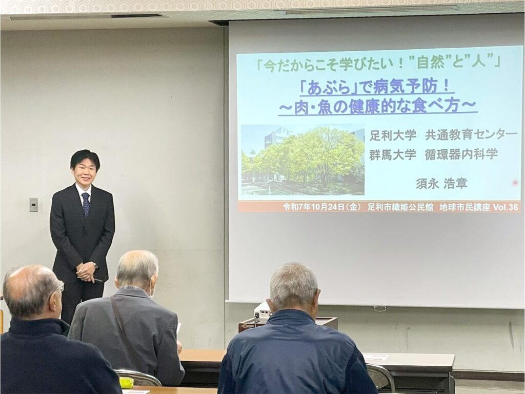2025年10月24日(金)、共通教育センターの須永浩章准教授が、足利市織姫公民館が主催する地球市民講座Vol.36 「足利大学講演」(連続4回)「今だからこそ学びたい!自然と人」の4回目(最終回)として、「「あぶら」で病気予防!~肉・魚の健康的な食べ方~」を主題とする講演を行いました。