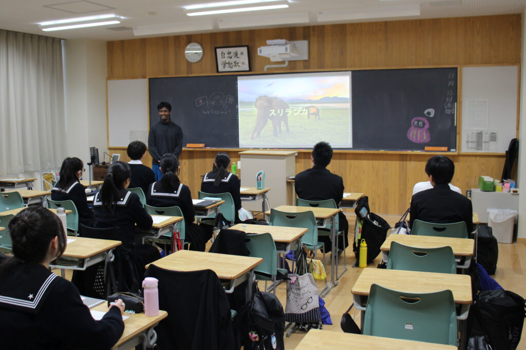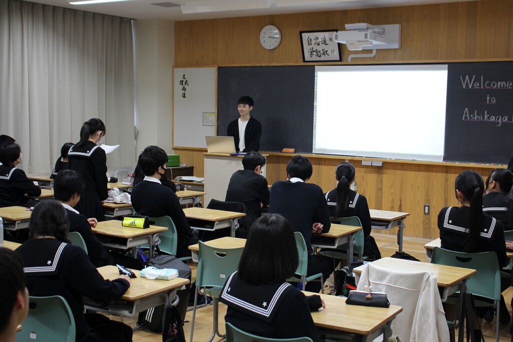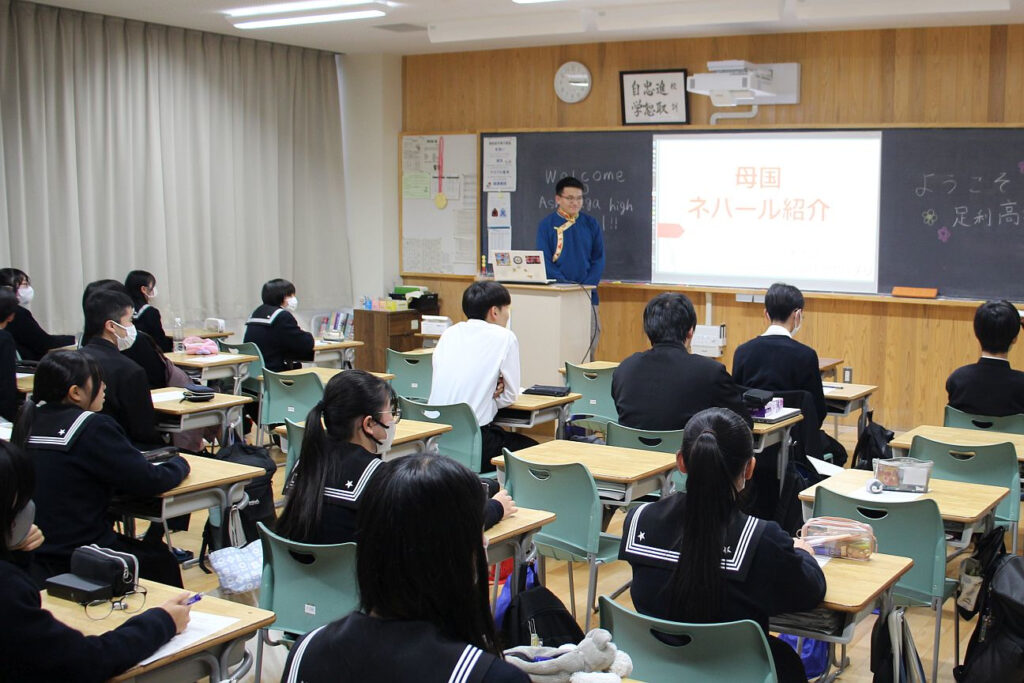 11/13、足利高校主催の「足利市の在住の外国出身の方々との交流会」が実施され、本学の留学生4名が参加しました。ネパール、スリランカ、インドネシア、ベトナムからの留学生たちは1年生のそれぞれのクラスに入り、自国の人口、食事、服装、有名人などを紹介しました。生徒たちは興味津々な表情で話を聞き、最後には沢山の質問がでるほどでした。