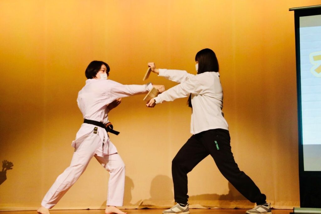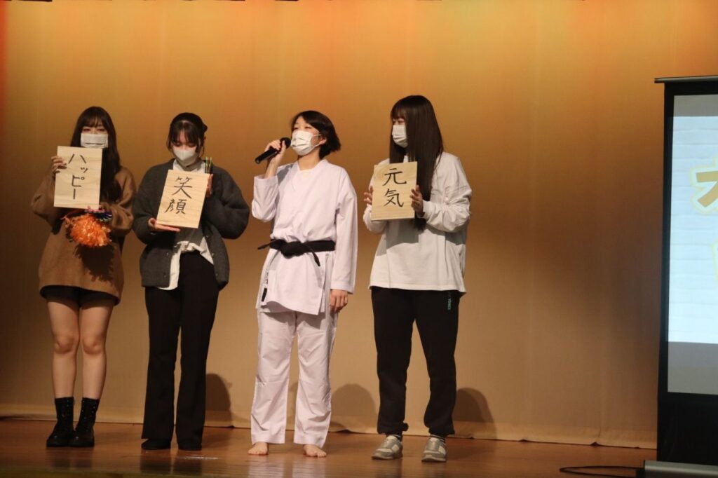 ステージでは、学生が空手の「いたわり」をテーマとした演武を披露し、「ハッピー」「笑顔」「元気」と書かれた板を用いながら会場を盛り上げました。演武では、仲間同士で息を合わせた板割りも成功し、会場から大きな拍手が送られました。