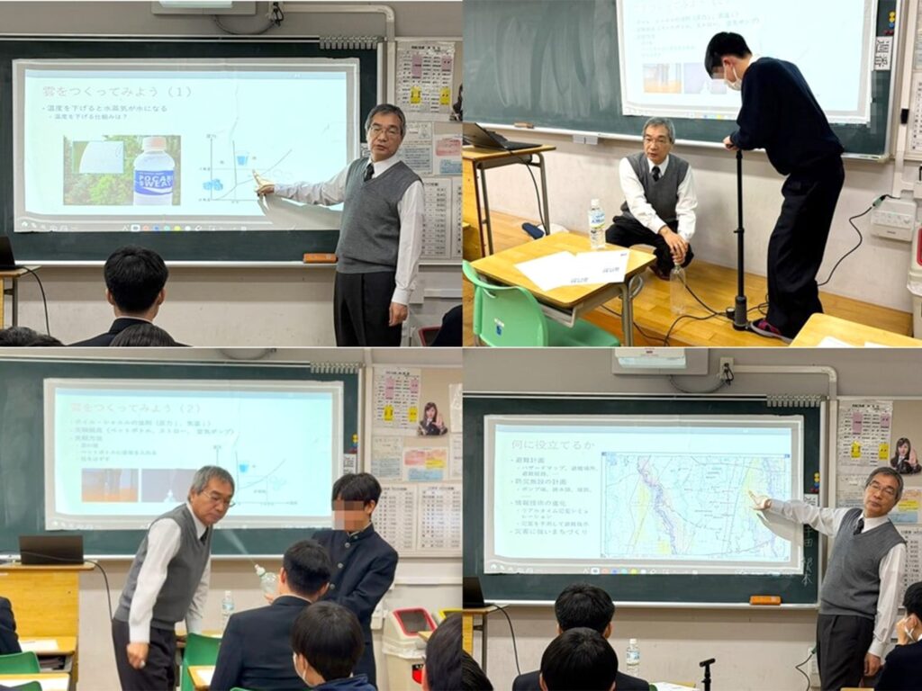 水蒸気を満たしたペットボトルを用意します。空気ポンプで圧力を加え、ふさいでいた栓を外すと、急激に圧力が無くなって気温が下がります。このとき水蒸気が小さな水滴へ変わり霧のように噴きだします。この現象から、大気中で雲が発生し、雨が降る仕組みを理解することができました。また、雨が地表を流れる様子をシミュレーションできると、洪水氾濫ハザードマップを作れるので、被害を小さくできるというお話をしました。