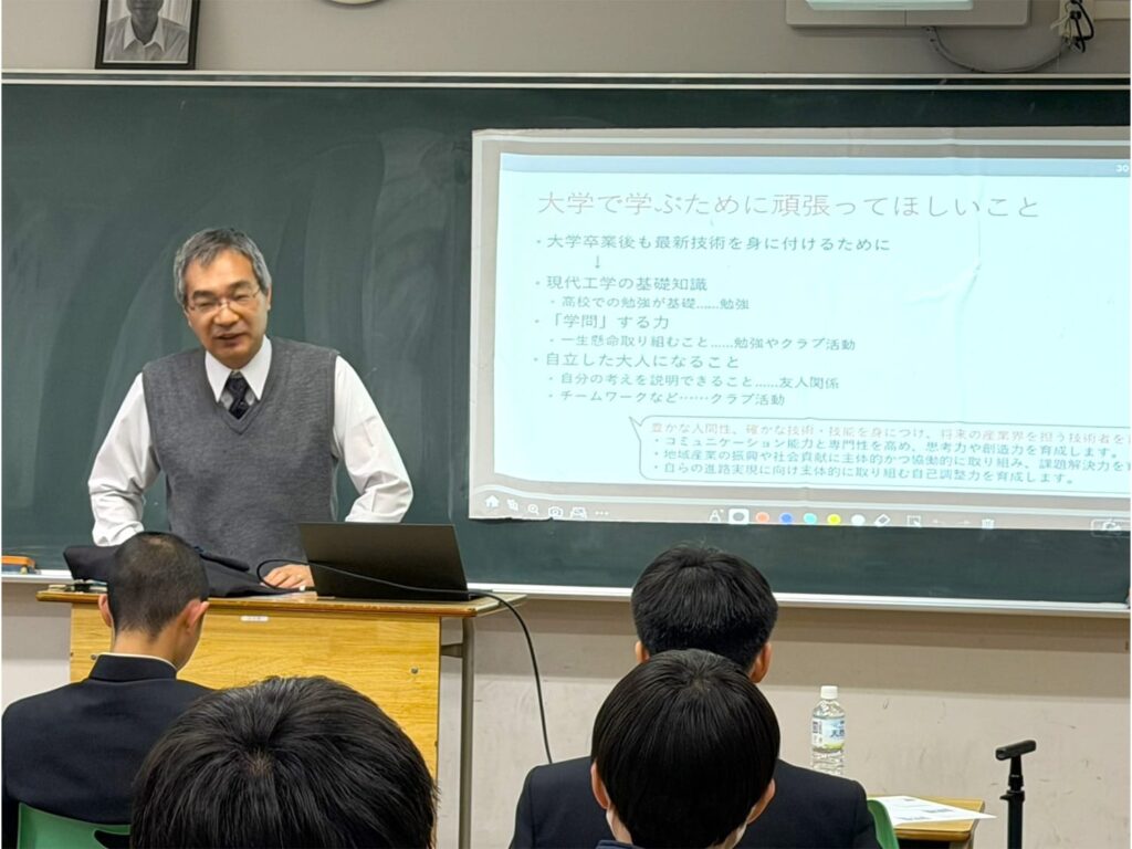 2026年2月25日(水)、建築・土木分野 土木工学コースの長尾昌朋教授が、宇都宮工業高校 環境建設システム系の第1学年生徒(40名)を対象に、学校設定科目「科学技術と産業」の中で、2年次より土木を学ぶ生徒への講話を行いました。