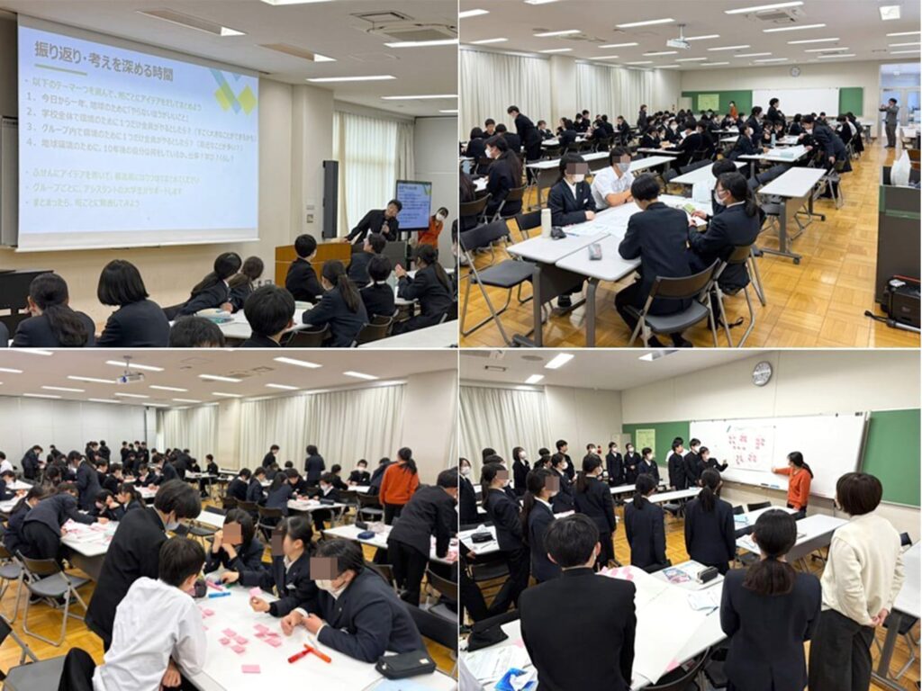 前半の講話の内容を受け、休憩後の後半は、グループ活動によって、環境問題について振り返り・考えを深める時間に取り組みました。各クラスの中で、5~6名のグループを作り、テーマを選んでアイディアを出し合い、考えを深めました。