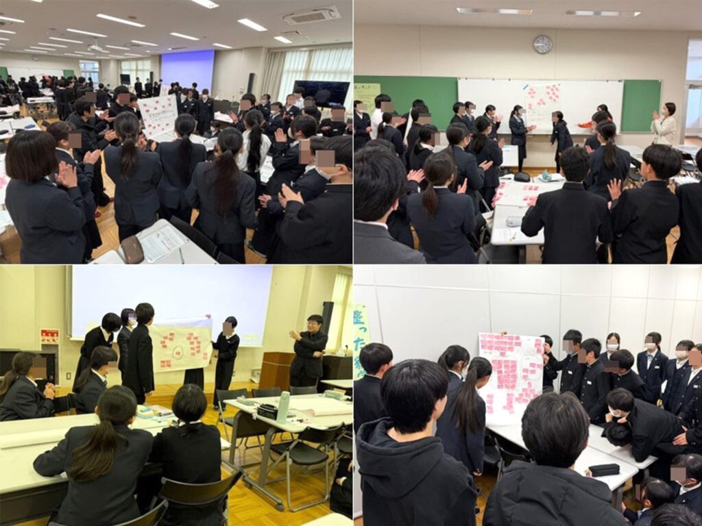 生徒たちは、約20分間、付箋にアイディアを書いて模造紙に貼り付け、グルーピングすることで考えをまとめました(KJ法の手法です)。